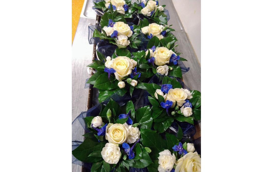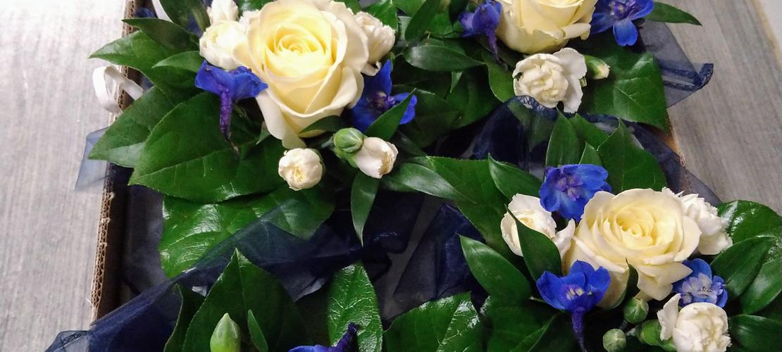 Muistotilaisuuden kukat Sini-valkeat asetelmat